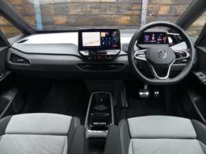 Premium family hatchback with over 200 miles of range, a big boot, the ability to rapid charge at 100kW and rear wheel drive for excellent driving dynamics. Subtle (and not grey!) stonewashed blue metallic with dual-tone dusty grey velours microfleece interior and practical VW premium hubcaps on 18" steels. Rare top spec with panoramic roof, full suite of safety and driver aids including Assistance package plus (semi-automated driving Travel Assist), dynamic speed sign display, speed limiter, front/lane and side assist, blind spot, augmented reality head-up display, fatigue detection plus dynamic chassis control and progressive steering. Park Assist Plus (self-parking), 360 area view camera and sensors. Infotainment Plus with Discover nav pro, touch-screen and smartphone charging. Air Care Climatronic 2-zone A/C, heated steering wheel and ergoActive powered front seats with lumbar support and massage, driver's with memory, 30-colour ambient lighting, keyless entry, variable bootfloor and privacy glass. Matrix LED headlights with auto control. We Connect ID.app. Balance of VW warranties: full to Dec 2026 and HV battery to 2031/100k miles. Battery state of health on target at 96%. Type 2 EV charging cable. Road tax from 2026 at £195 (no expensive car supplement). We are not tax experts but we know that electric cars benefit from very attractive company car tax (benefit in kind): £27-£59 a month in 2026/27. One previous owner and VAT Qualifying.