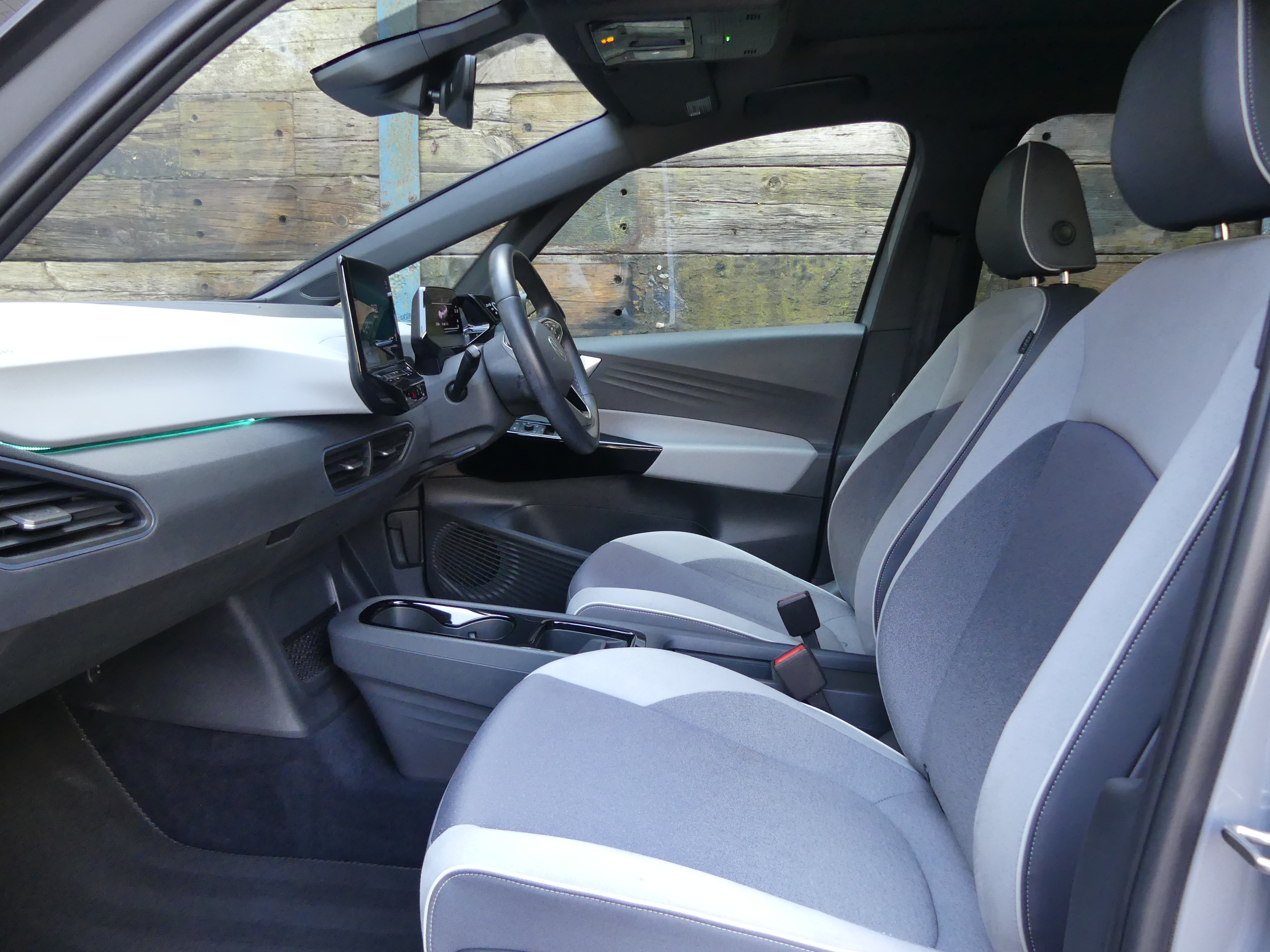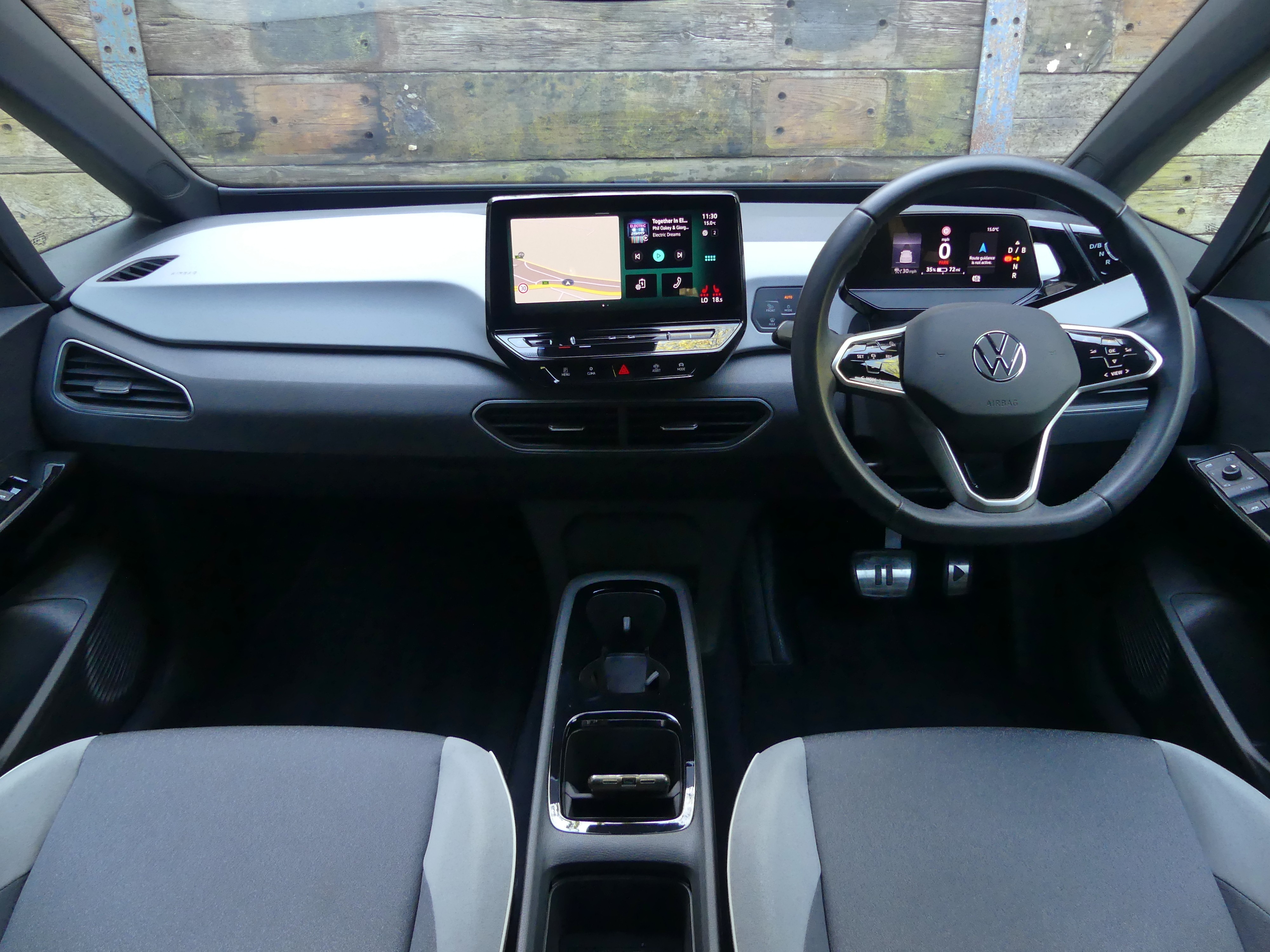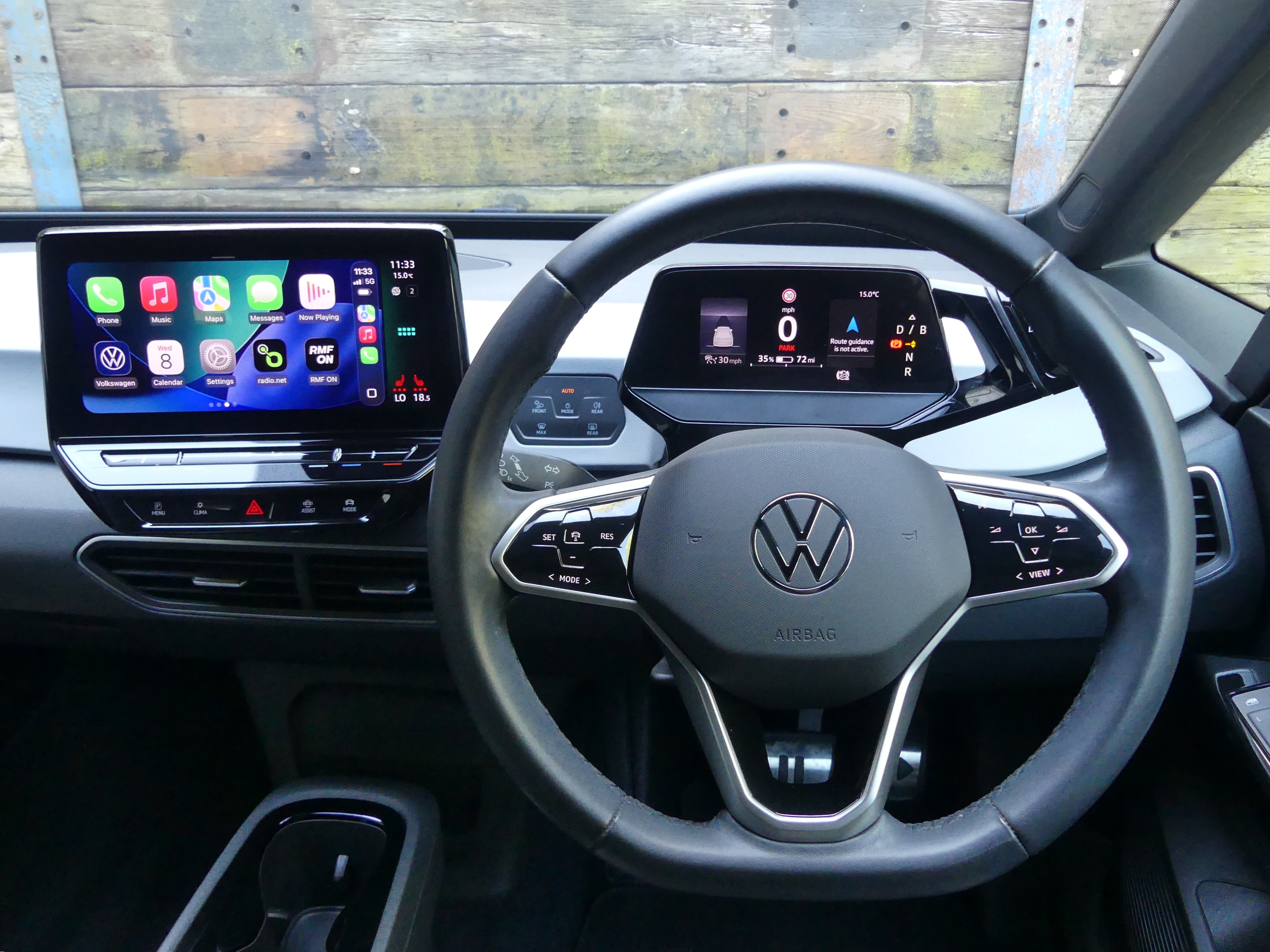 Like the Golf, a premium family hatchback with over 200 miles of range, big boot, ability to rapid charge at 100kW (30 minutes) and rear wheel drive for excellent driving dynamics. Classic in Moonstone Grey, artificial suede/leather upholstery and practical 18" steels with premium VW hubcaps. Massive spec with panoramic roof and sunblind, safety and driver aids including adaptive cruise, speed limiter, Front and Lane assist, dynamic speed sign display, matrix LED headlights with cornering, dynamic light assist, AutoHold and fatigue detection. Park Assist guidelines, rear view camera and sensors. Discover nav pro with 10” touch-screen, DAB/music streaming, smartphone charger. Air Care Climatronic 2-zone A/C, heated front seats and steering wheel, 30-colour ambient lighting, keyless entry and privacy glass. Variable boot floor. Innovative ID.Light. We Connect ID.app. VW HV battery warranty to March 2030/100k miles and 6 months' WarrantyWise from purchase. Great battery health, ahead of target, at 95%. No budget tyres and rears on 6mm (nearly new), fronts good at 4mm. Full VW service history (March 26). Type 2 fast charging cable. Road tax £200 (no expensive car supplement). We are not tax experts but we know that electric cars benefit from very attractive company car tax (benefit in kind): £24-£55 a month in 2026/27. One previous owner and VAT Qualifying.